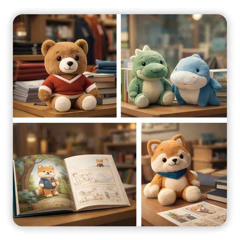 Typical support: character/story translation, durable fabric/shape-hold guidance, retail packaging/hangtags, high-volume replenishment planning.