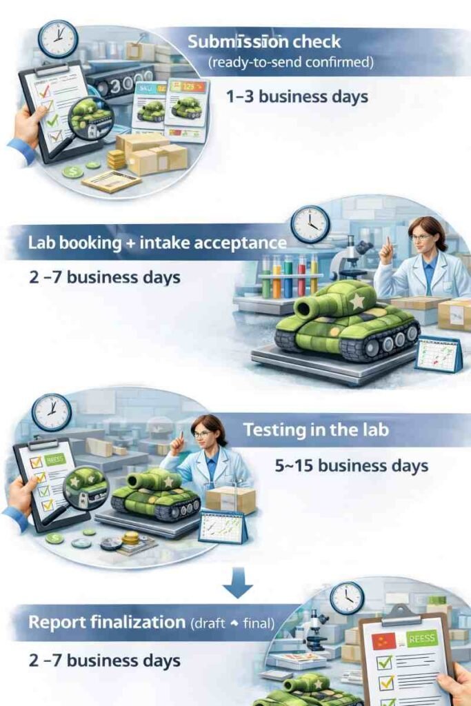 A lab lead time is not a single fixed number. The report date is mainly decided by (1) whether the submitted sample is truly final, (2) how much the lab needs to cover, and (3) the lab’s booking queue and report format requirements. A milestone timeline keeps the ship window realistic.