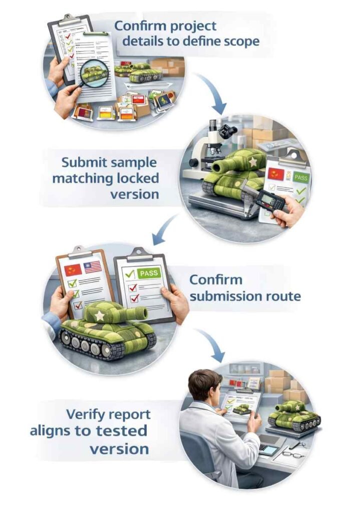 Third-party testing stays predictable when coordination follows a simple order: confirm the project details that define scope, make sure the submitted sample matches the locked version, choose the right submission route, and verify the report matches the tested version. Most delays happen when version alignment is unclear.
