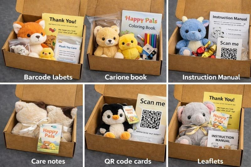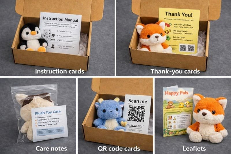 Instruction cards, thank-you cards, care notes, QR cards, leaflets—placed in fixed positions.