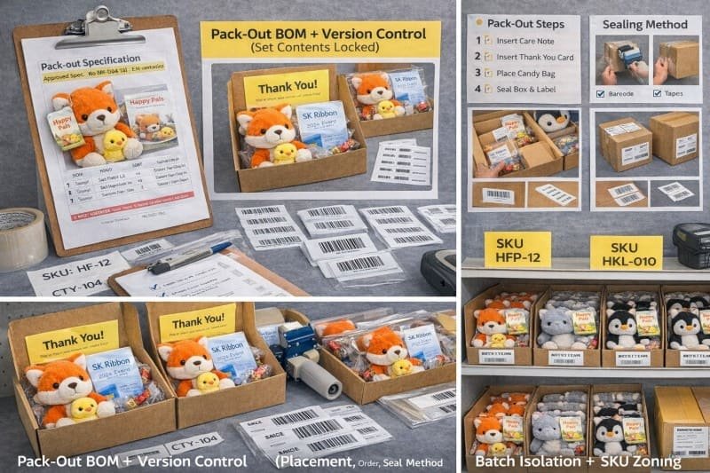 Pack-out is controlled by BOM versioning, workstation reference photos, SKU separation, and a second-person verification step on critical points.