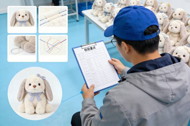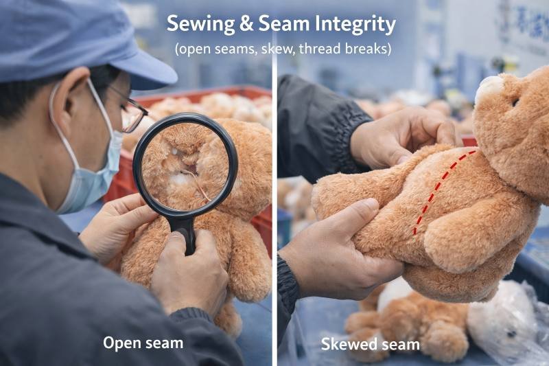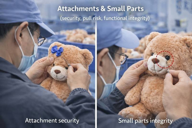 Checkpoints:attachment points, seam reinforcement areas, pull-risk zones (loops, straps, keychains), consistency of placement and orientation.