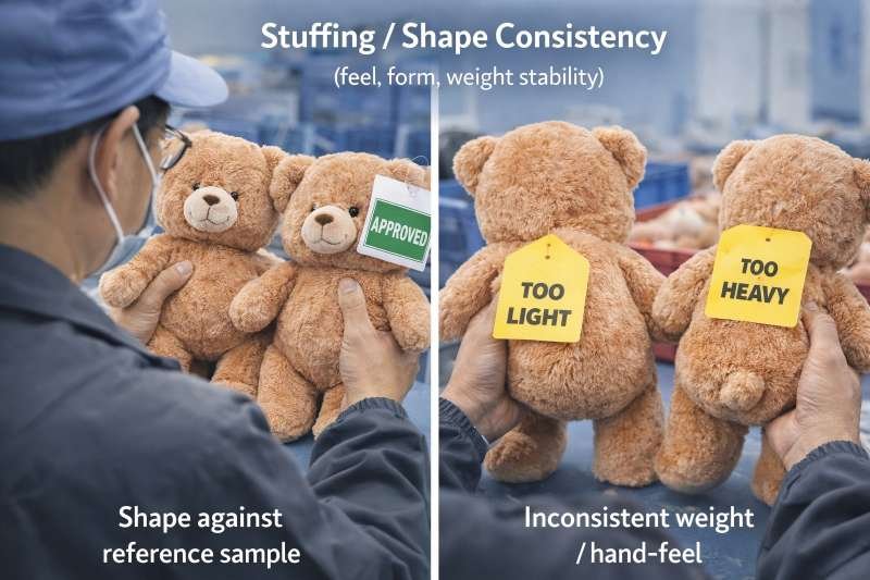 Checkpoints:shape profile against reference, firmness balance across key zones (head/body/limbs), weight range consistency when specified.
