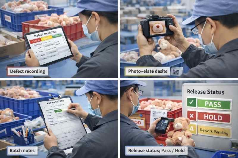 Recorded outputs:defect type + location notes, cropped seam photos for repeat issues, rework/hold decision log.