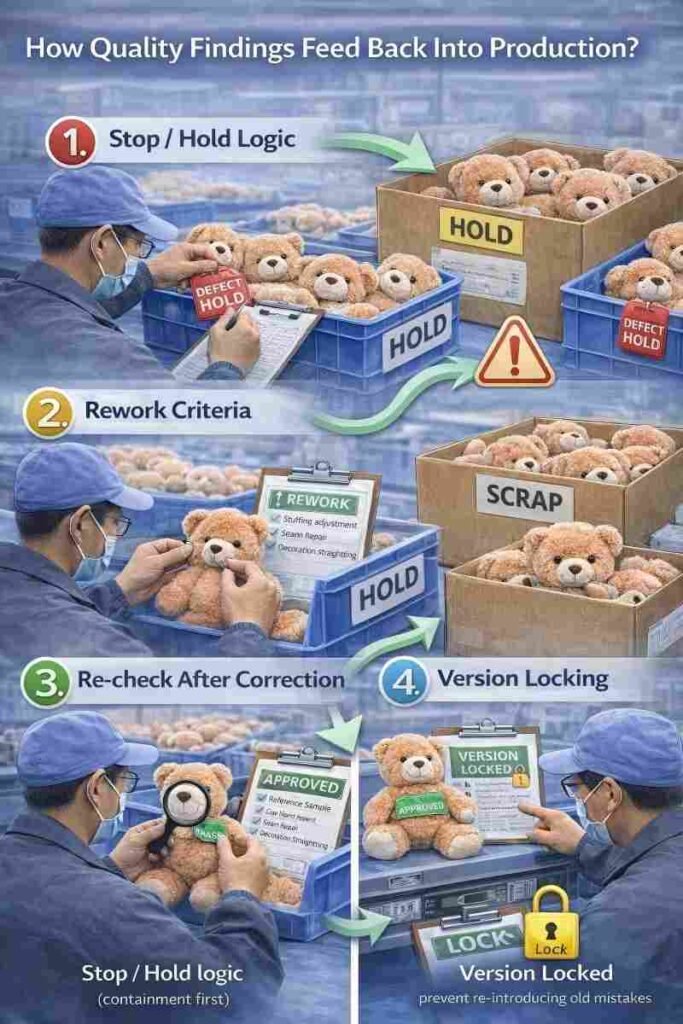 Quality control only works when findings change production behavior immediately. This module shows the corrective loop that prevents the same defect from repeating across the batch—and keeps bulk output inside the approved reference.